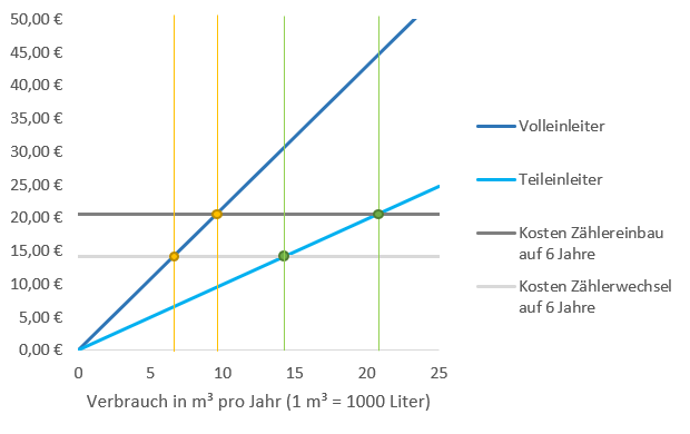 Als Teileinleiter zahlen Sie eine Kanalbenutzungsgebühr von 0,99 Euro/m³ zuzüglich der Abwassergrundgebühr von 120 Euro/Jahr. Durch den Gartenwasserzähler entsteht lediglich das Einsparpotenzial im Bereich der mengenbezogenen Kosten. Damit sich die Investition in einen Gartenwasserzähler bei Ihrer Form der Kanalbenutzung amortisiert, sollten Sie in den ersten sechs Jahren im Durchschnitt 22 m³/Jahr und ab dem sechsten Jahr wenigsten 15 m³/Jahr Wasser über den Gartenzähler abnehmen.
